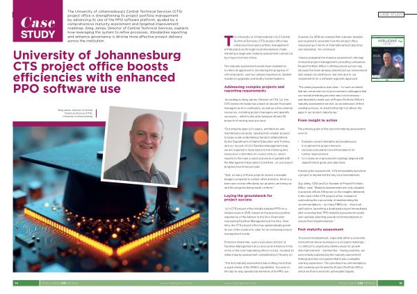 The University of Johannesburg’ s Central Technical Services( CTS) project office is strengthening its project portfolio management by advancing its use of the PPO software platform, guided by a comprehensive maturity assessment and targeted improvement roadmap. Greg James, Director of Central Technical Services, explains how leveraging the system to refine processes, standardise reporting and enhance governance is driving more effective project delivery across the institution.