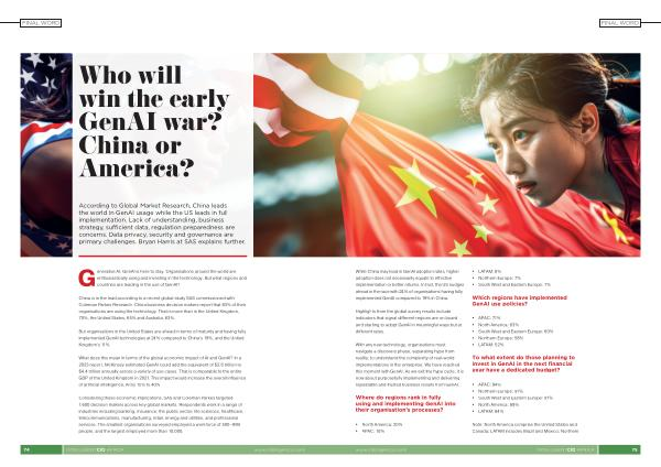 While China may lead in GenAI adoption rates , higher adoption does not necessarily equate to effective implementation or better returns . In fact , the US nudges ahead in the race with 24 % of organisations having fully implemented GenAI compared to 19 % in China .